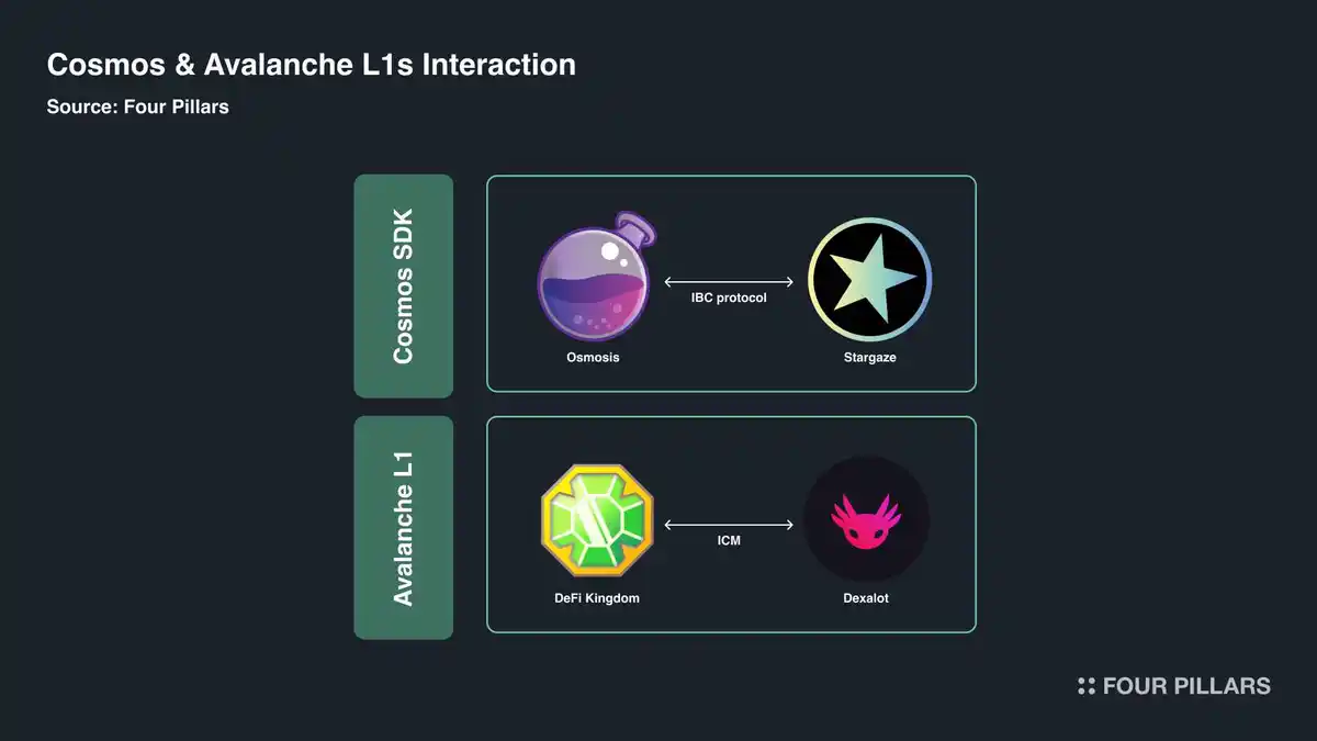 此外,这种方法还具有同时追求多功能性和专业性的优势。在Cosmos和Avalanche生态系统中,每个链都可以构建针对其独特需求优化的环境,同时通过Cosmos的IBC(链间通信)协议和Avalanche的链间消息传递(ICM)与其他链保持互操作性。