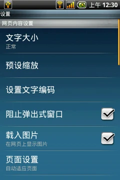 网页设置项目里,首派A60支持文字大小更改,支持自动阻止弹出式窗口,同时还支持启用或者是关闭相关Gears(扩展浏览器功能的应用程序),这点更是好过iPhone很多。