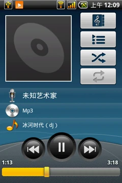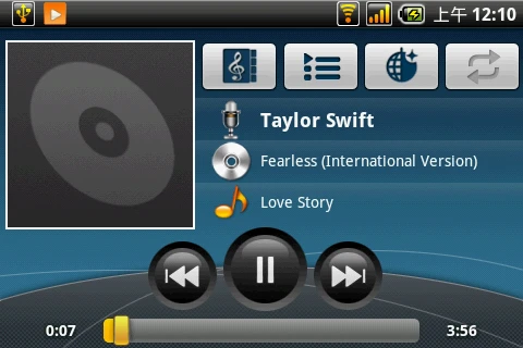 横屏模式下,该播放界面的显示效果也非常不错。笔者测试期间应用的是诺基亚N86附赠的原装耳机,该机的播放效果还是比较不错的,高中低三频都能很好的表现出来。