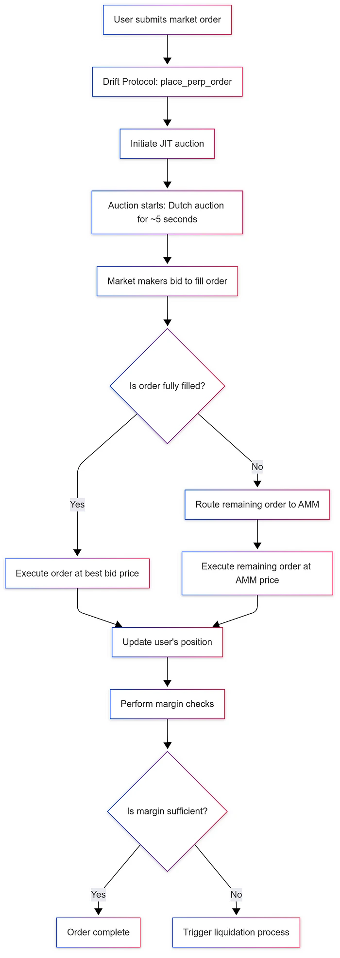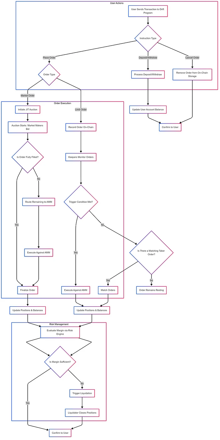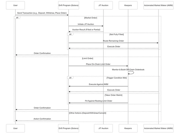 Drift Protocol 通过使用户能够通过发送到 Solana 区块链上其指定程序地址的交易来发起交互,从而协调其指令流。这些交易会调用与用户操作相关的特定程序指令,例如存入或提取资产、下达交易订单或取消现有订单。特别是,市价单以 Just-In-Time (JIT) 拍卖开始,以优化执行。