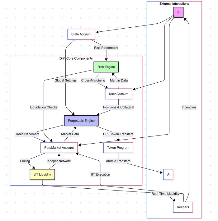 Drift 设计的核心要素是它的 cross-margined 风险引擎。该系统允许用户利用他们在不同资产和头寸中的全部抵押品余额来满足保证金要求,从而提高资本效率。然而,这种方法需要一个复杂的框架来计算保证金和管理用户投资组合中潜在的清算。此外,Drift 的订单簿、流动性提供和清算流程由一个去中心化的 Keeper Network 推动。该网络由受激励的代理和做市商组成,在提供 Just-In-Time (JIT) 流动性、执行订单撮合以及确保及时清算抵押不足的头寸方面发挥着至关重要的作用。