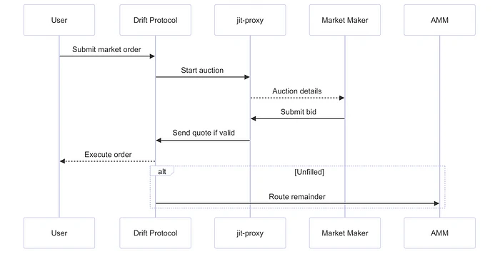 Just-In-Time (JIT) 流动性机制是 Drift Protocol 中的一项核心创新,旨在增强流动性,特别是现货和永续合约交易中的市价单,从而有效地解决了链上流动性池固有的局限性。当用户提交市价单时,该协议会立即启动一个短期荷兰式拍卖,通常持续大约五秒钟。在这个短暂的时间窗口内,作为流动性提供者的做市商有机会对订单进行竞标,旨在以等于或优于拍卖价格的价格完成订单。这种竞争性竞标过程对于实现交易者的最佳执行价格至关重要。