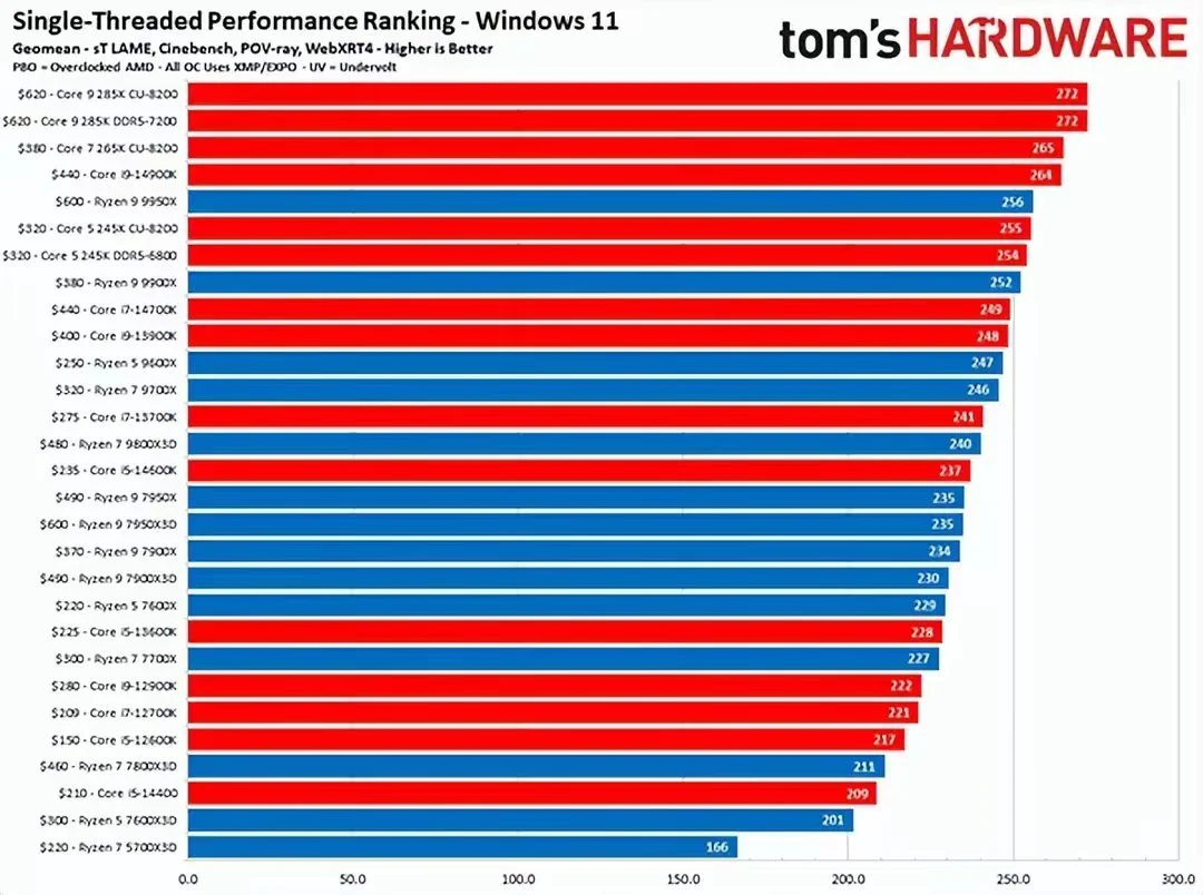 不过,锐龙9 9950X 的单线程性能依然不容小觑,虽然稍微落后于Intel的顶级产品,但其优秀的多线程表现 使其成为一款性能均衡的强力处理器。