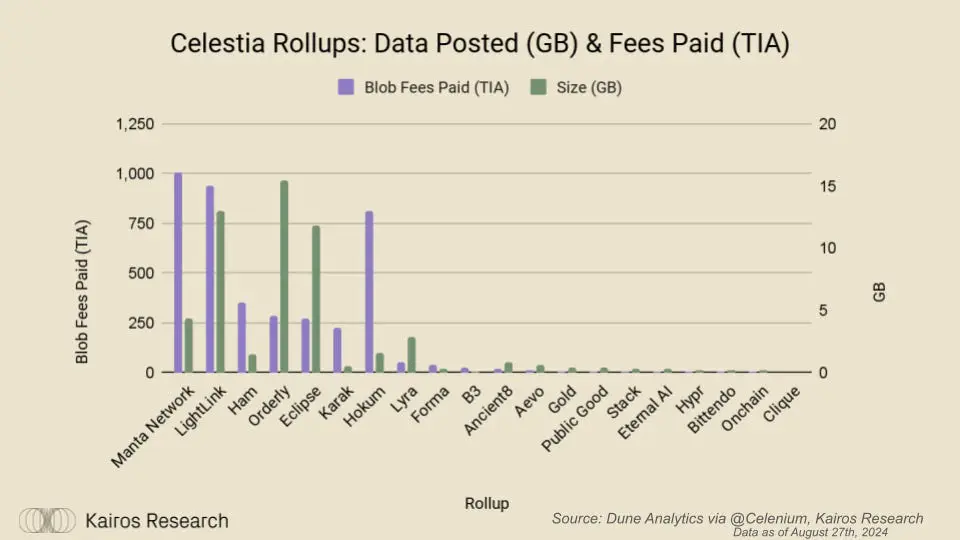 例如,Eclipse 是一个 SVM 汇总,仅在 28 天前开始发布数据块,已成为 Celestia 上 86% 的数据块份额发布者。他们的主网尚未向公众开放,尽管其中许多使用可能只是纯测试以确保技术的稳健性,但它为高吞吐量汇总所能达到的水平提供了一些思路,并表明它们将在数据可用性上比我们今天所看到的大多数汇总显著更高地消费。