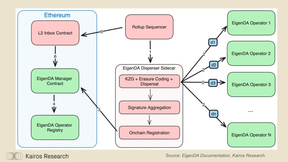 在聚合收到的签名后,分发者通过发送一个交易到 EigenDA 管理合同,使用聚合的签名和数据块元数据在链上注册数据块。