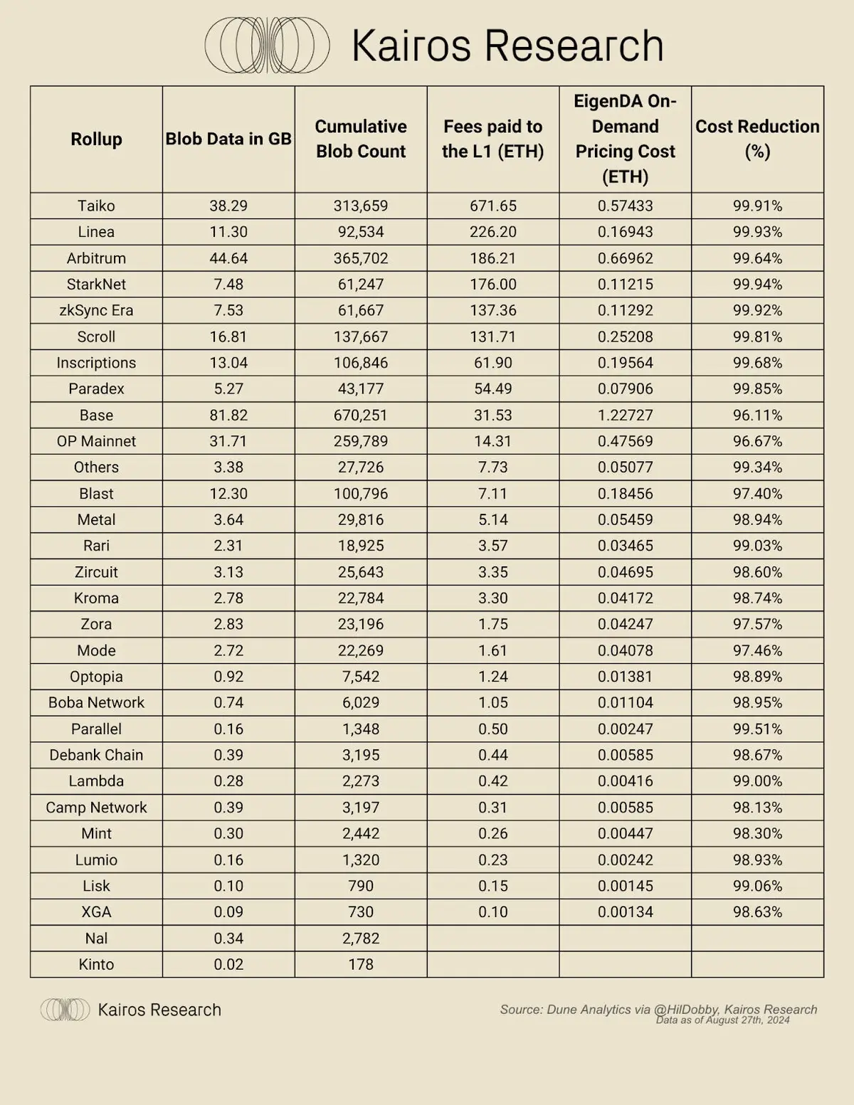 仅凭这项分析,已经有 6 个汇总超出了费用期限,从而使他们选择 EigenDA 的第一层定价看起来合理,但从纯数据吞吐量角度来看,似乎并不合理。实际上,利用 EigenDA 的按需定价仍将导致平均约 98.91% 的直接成本降低。
