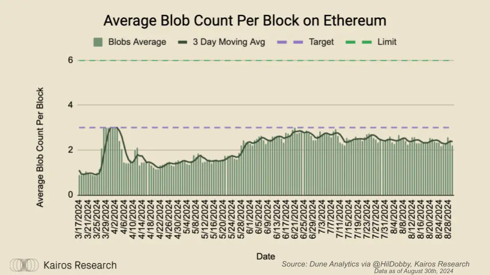 这个限制确实每天都会达到多次,表明以太坊对数据块空间的需求充足。虽然在撰写本文时,以太坊的基础费大约为 5 美元,但我们应该注意到,这个费用是与 ETH 的价格相关的,这与大多数 DeFi 活动相同。因此,在 ETH 价格积极上涨的时期,会出现更多的活动,这反过来会导致对数据块空间的更高需求。因此,为了应对 DeFi 领域中的投机活动增加,或将网络开放给未见的用例,数据可用性成本必须进一步降低。仍然有相当大的动力进一步降低这些成本,以鼓励持续的用户活动。