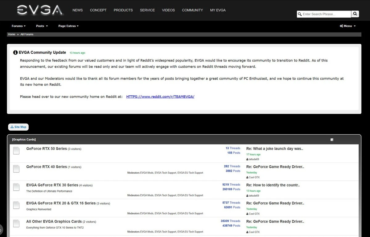 自从关闭显卡业务后,EVGA随后又逐步退出了主板市场,虽然仍在销售电源和散热产品,但是在PC DIY市场的存在感比起以前低了太多。EVGA最后一次产品更新要追溯到2023年8月,当时推出了支持ATX 3.0标准的SuperNOVA 1000W/850W Gold FTW电源。据VideoCardz报道,EVGA已发布公告,宣布关闭官方论坛,仅保持只读状态,并鼓励会员转移到更为流行的Reddit。