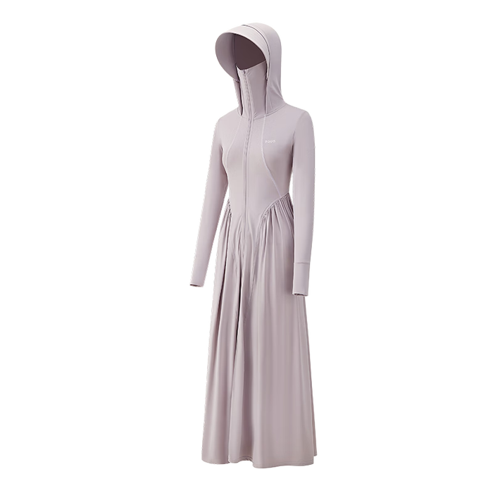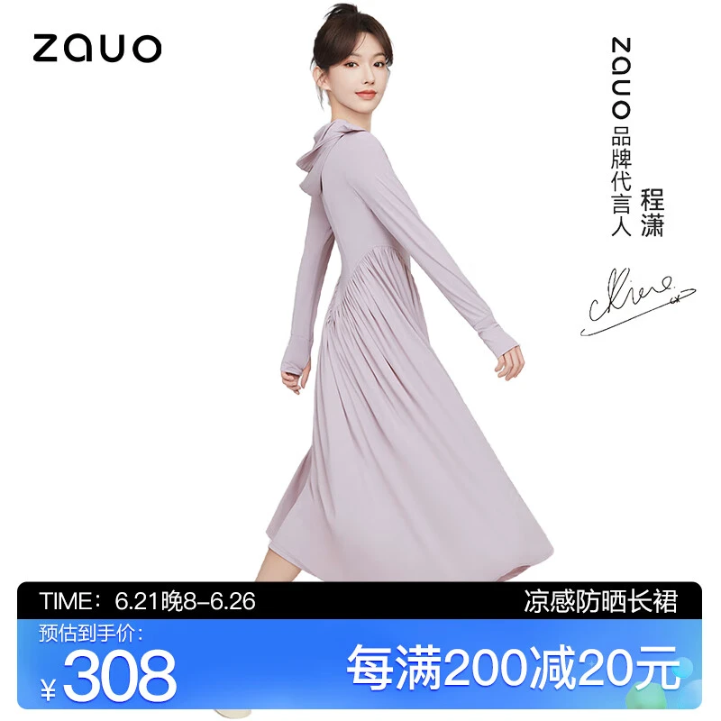 这款zauo连帽防晒长裙紫色M款,是我非常推荐的一款防晒衣。它采用的凉感科技面料,穿上体感凉爽,即使在高温出行也不会感到闷热。这种面料不仅适合户外防晒,也可以在日常逛街、度假时穿着,拍照时也非常出片。