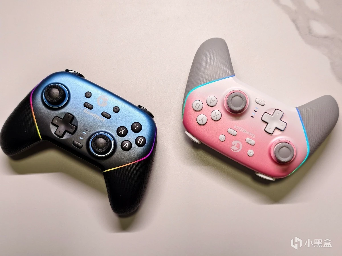 磨砂质感的外壳加包胶握把,属实是把xbox精英手柄给取其精华去其糟粕了。RGB幻彩灯带(单条灯带五颗灯珠)也相当酷炫,灯光变换自然,软件调节,同时也支持组合键快捷调节全部效果。摇杆一圈也用上了蓝色的POM耐磨环。除此之外,将超新星的磁吸外壳取下,玩家可以自由调整ABXY的位置,秒变Switch手柄。这里强烈建议盖世小鸡在配件中加入△□○×这四个按键,就可以更好地模拟ps手柄啦。