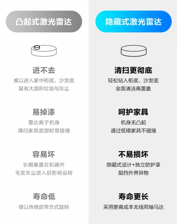 此外,360扫地机器人X100隐藏式雷达设计,更是颠覆行业标准的独家设计。传统的扫地机都有一个高高凸起的雷达,宛若天线宝宝,在地面清洁时很难钻入沙发、家具底部等,而且容易磕碰家具和机身,以往产品甚至出现过不少因碰撞造成损坏的情况。360扫地机器人X100将雷达藏在薄至8.5厘米厚的机身中,没有辫子的它轻装上阵,钻沙发底、去床底,扫拖不碰头,清扫范围大大拓展,解决了沙发、家具底底部等狭窄空间的清洁问题。