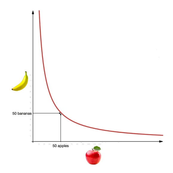 (图:外面的汇率总在这条线上的某个点,于是即便我们不知道外面的汇率是多少,只要根据这条曲线来算汇率,最终AMM给出的汇率肯定是在外面的汇率附近浮动,图片引自https://medium.com/dragonfly-research/what-explains-the-rise-of-amms-7d008af1c399)