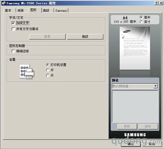 产品还带有三星传统的“省墨模式”,大约可以节约30%的墨粉量,不过在“省墨模式”下,打印出来的字迹黑度有一定的降低,不过效果并不是很明显。本次笔者采用的是最佳模式来进行的评测,从实际的效果来看,字体清晰,大小着色均一,锐利度也是相当不错的,非常适合文字类打印。