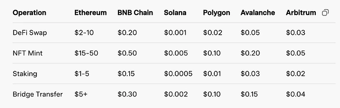 - DeFi 交换(类似于 Uniswap):以太坊 2-10 美元(10 万 gas);Solana 0.001 美元(并行执行);Polygon 0.02 美元。