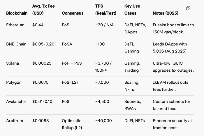 { "type": "scatter", "data": { "datasets": [{ "label": "Blockchains", "data": [ { "x": 0.44, "y": 30, "label": "Ethereum" }, { "x": 0.125, "y": 100, "label": "BNB Chain" }, { "x": 0.00025, "y": 3700, "label": "Solana" }, { "x": 0.0075, "y": 7000, "label": "Polygon" }, { "x": 0.055, "y": 4500, "label": "Avalanche" }, { "x": 0.0088, "y": 40000, "label": "Arbitrum" } ], "backgroundColor": ["#FF6F61", "#6B7280", "#22C55E", "#8B5CF6", "#F59E0B", "#3B82F6"] }] }, "options": { "scales": { "x": { "type": "logarithmic", "title": { "text": "Avg. Fee (USD)" } }, "y": { "title": { "text": "TPS" } } }, "plugins": { "title": { "text": "TPS vs. Fees (Aug 2025)" } } } }结论