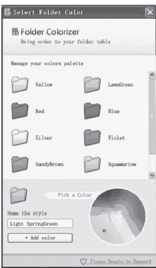 其实,这样的问题很好解决,使用Folder Colorizer这款小软件就能以颜色区分Windows系统中的文件夹,它的原理很简单,就是利用彩色图标替换文件夹。下载安装后右击鼠标,在弹出的菜单中选择“Colorize!”的选项,系统预先设置了八种鲜明的文件夹色彩方案,当然用户也可以根据喜好,在色卡中自定义,加入新方案(如图)。一旦设置,颜色会一直保持,即便重启也不会恢复。如果想回到最初颜色的话,选择“Restore original color”即可。