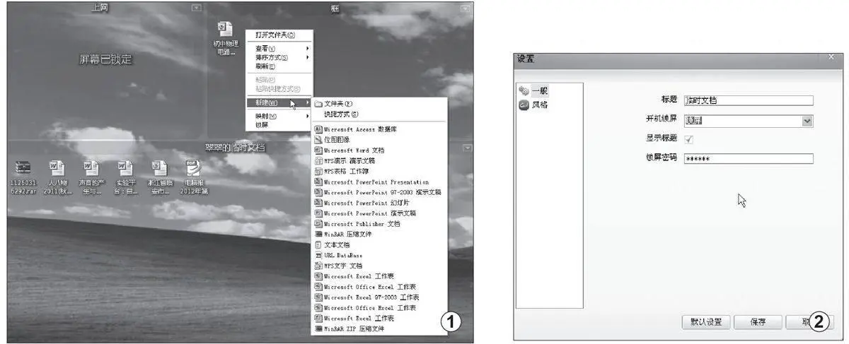 如何建立各自的私密小“桌面”呢?单击框右上角的倒三角按钮,选择“新建桌面框”即可得到一个新的框,再选择倒三角按钮下的“设置”(如图2),设置“开机锁屏”为“锁屏”,输入锁屏密码后单击“保存”,这样开机后该框自动锁屏,单击框时要求输入密码;需要再次锁定时,右击框,选择“锁屏”即可。