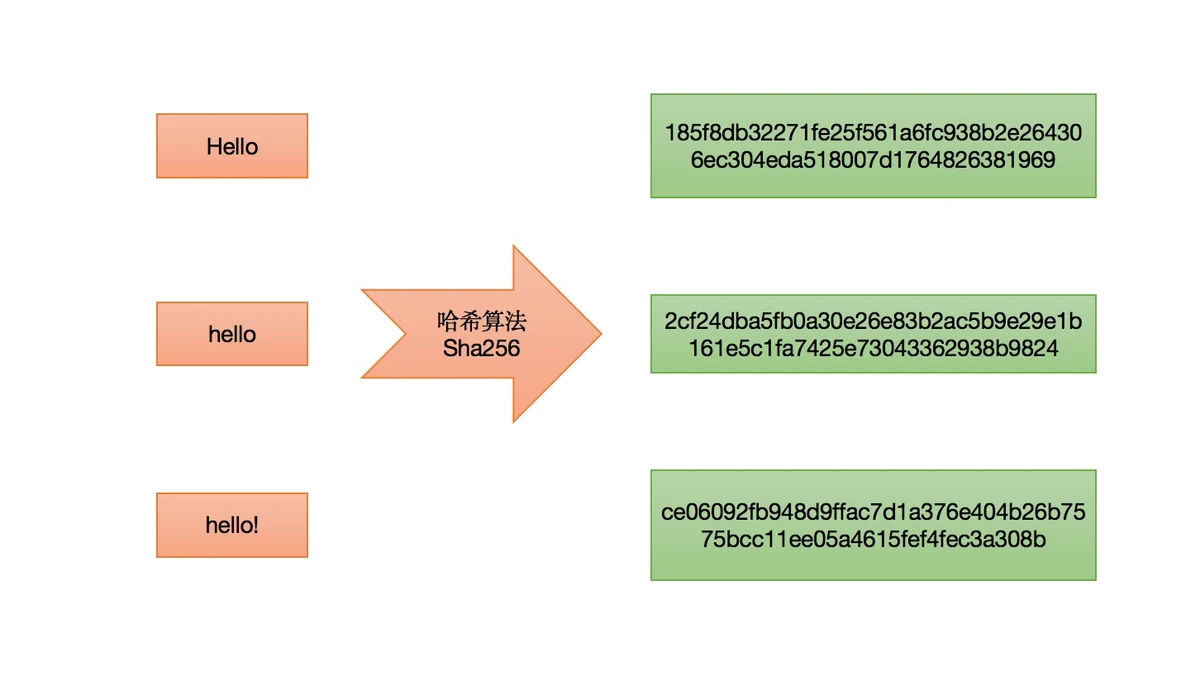从上图中,我们可以看到只有细微差异的三个输入值:”hello”、”Hello”、”Hello!“,其对应的哈希值天壤之别。 你可以从这个在线工具体验哈希值。