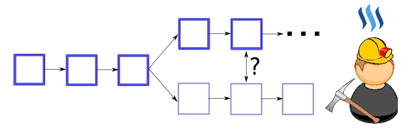 到底该选哪一条继续延伸?此时就看网络中的大部分矿工如何选择,默认原则是选择最长的一个分支继续挖矿。经过短暂分叉后又走在一起,分分合合,携手共进。