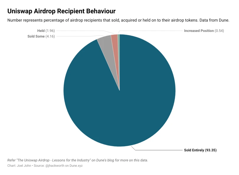 在一年内,从空投中收到 Uniswap 代币的所有钱包中,约有 93% 的钱包出售了它们。看来市场毕竟不想管理“去中心化”协议。