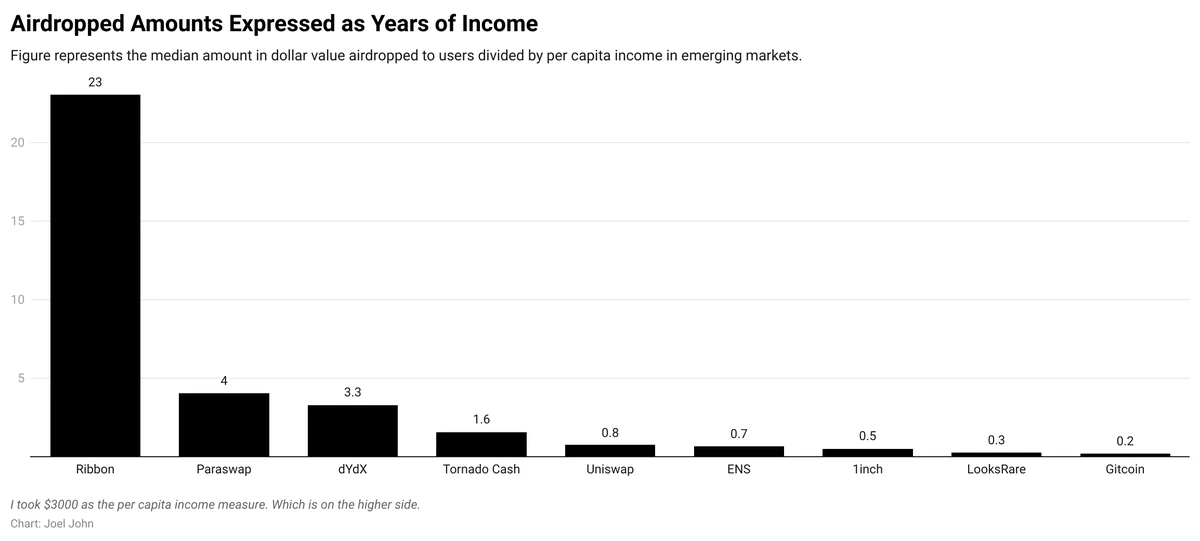 下图将新兴市场的空投金额表示为多年的收入。当你有机会通过几分钟的工作获得一年的收入时,你就会花费数天时间从数百个钱包中进行挖矿。这里有一个重要的警告。下图假设 3000 美元是新兴市场的平均收入。收入如此之低的人可能不太会将数千美元部署到 Ribbon 协议中以获取空投。
