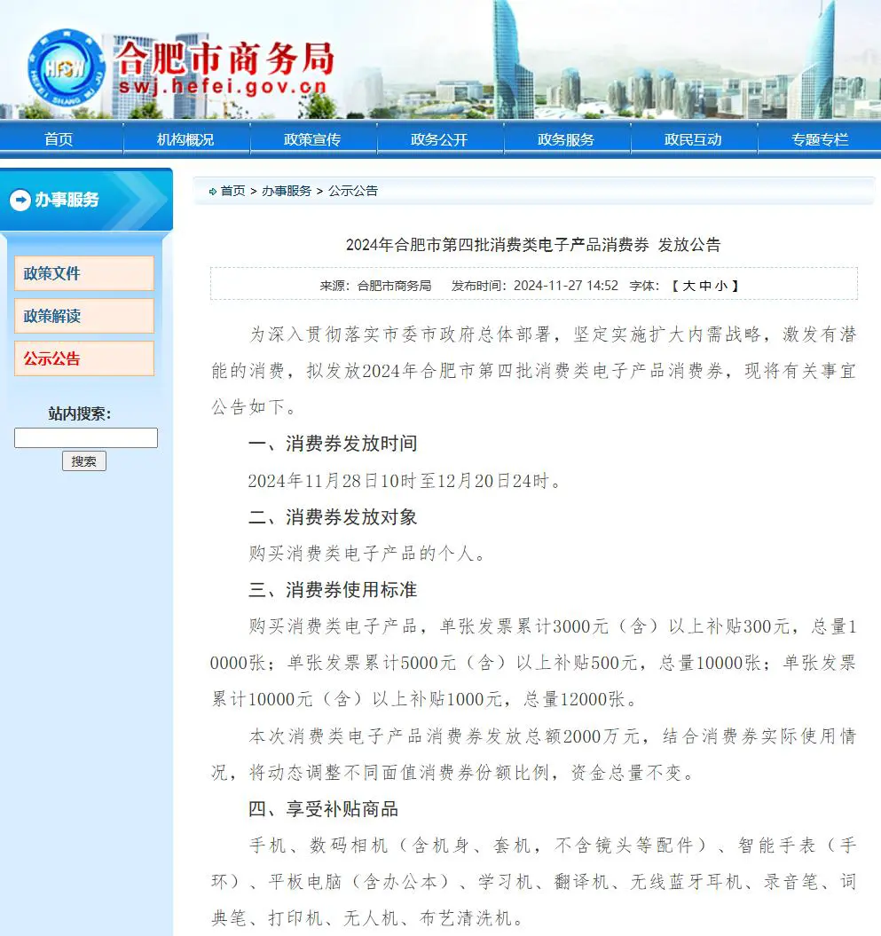 据了解,合肥市商务局官网显示,11月28日10时至12月20日24时,2024年合肥市第四批消费类电子产品消费券发放,总额2000万元,其中300元补贴券10000张;500元补贴券10000万张;1000元补贴券12000张,共计32000张,手机、数码相机、智能手表等多种商品均享受补贴。