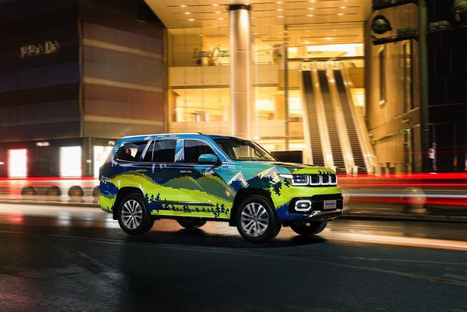 车头方面,五格U型隔栅延续了家族化设计语言,与同门师兄弟不同的是,BJ60方形大灯组与隔栅设计融为一体,占据隔栅两端,不再与隔栅分开设置。U型隔栅采用全LED,灯条亮起时很有攻击性。