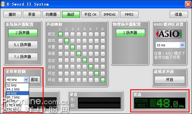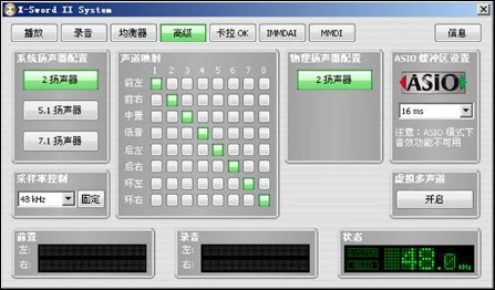 我们鸡蛋里再挑挑骨头,笔者认为购买该卡的用户一般对声卡要求算是比较高的了,那么在第一界面“播放”页面空置率较大的情况下,常用的高级的很多选项就应该整合上去。特别是虚拟多声道、采样率调节以及ASIO延迟选项。而“高级”处的声道映射在页面出现空置后可以做视觉化声道测试功能界面。这样如果将前左映射至8号后,就可以立刻测试是否设置得当了。