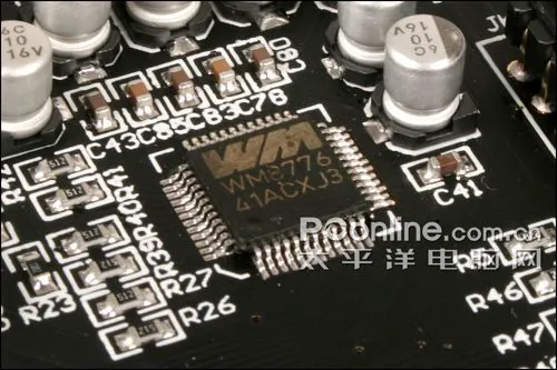 WM8776是Wolfson微电子的一款编码解码器,具备DAC/ADC功能,不过笔者猜测在该卡上应该只是做ADC吧。相比创新Sound Blaster X-Fi Xtreme Music的WM8775来说,它的信噪比指标更高(102dB A加权),支持声道数也更多。官方的介绍是,WM8776全面支持独立的ADC和DAC采样速率。音频数据接口可支持I2S、左调整、右调整和DSP格式。每个ADC声道(共五个)均可通过自动电平控制来进行可编程的增益控制。可支持16-32位的数字音频输出字长和32kHz-96kHz的采样速率。更详细的资料大家可以点击这里。