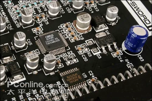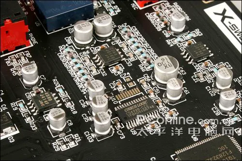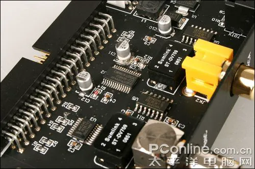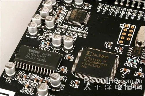 XILINX的CPLD元件我们经常在国内声卡产品中见到,XC95144XL是一块大容量复杂可编程逻辑器。它的作用是进行时钟分配和信号路由。此技术可保证使整个轩辕II系统各器件的时钟最大限度的同步。另外,借助于信号路由功能,让主卡PCB上各信号布线长度尽量减小,达到最大限度的信号完整性。