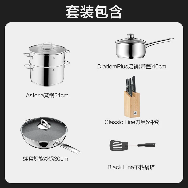 嘿,大家好!今天给大家介绍一下WMF福腾宝不锈钢炒锅套装10件全能刀具锅组。这个套装包括蜂窝炽能炒锅30cm、ClassicLine刀具5件套、Astoria蒸锅24cm、DiademPlus奶锅16cm、BlackLine不粘锅铲。炒锅内径30cm,高7.5cm,容量5.1L,采用316L不锈钢,适合各种灶具。刀具锋利耐用,切菜迎刃有余。