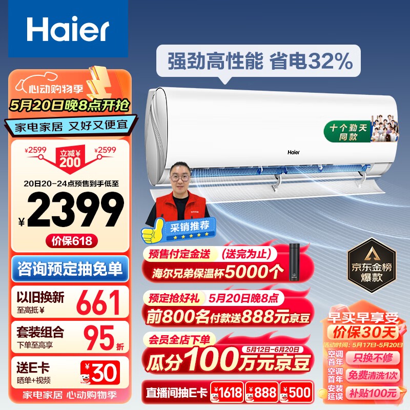海尔(Haier)劲爽 1.5匹新一级变频 冷暖 壁挂式空调挂机 冷媒变流 KFR-35GW/B5LAA81U1以旧换新