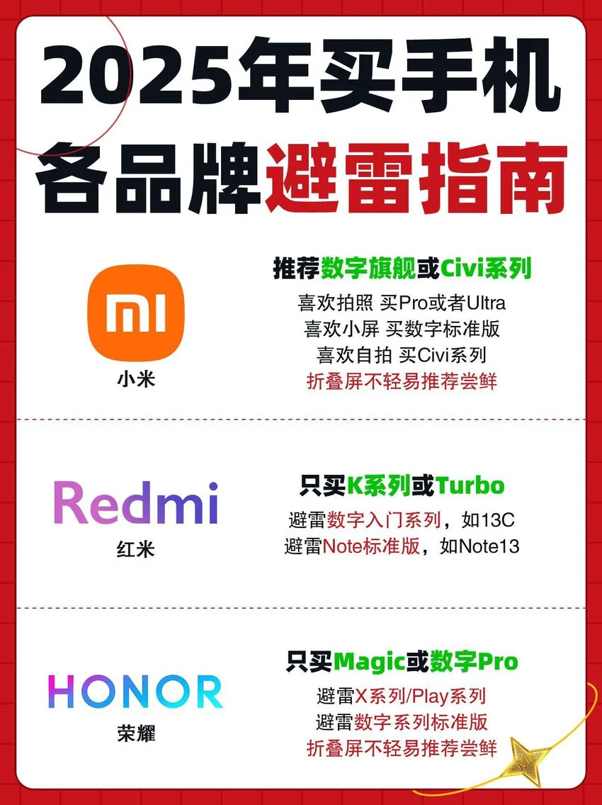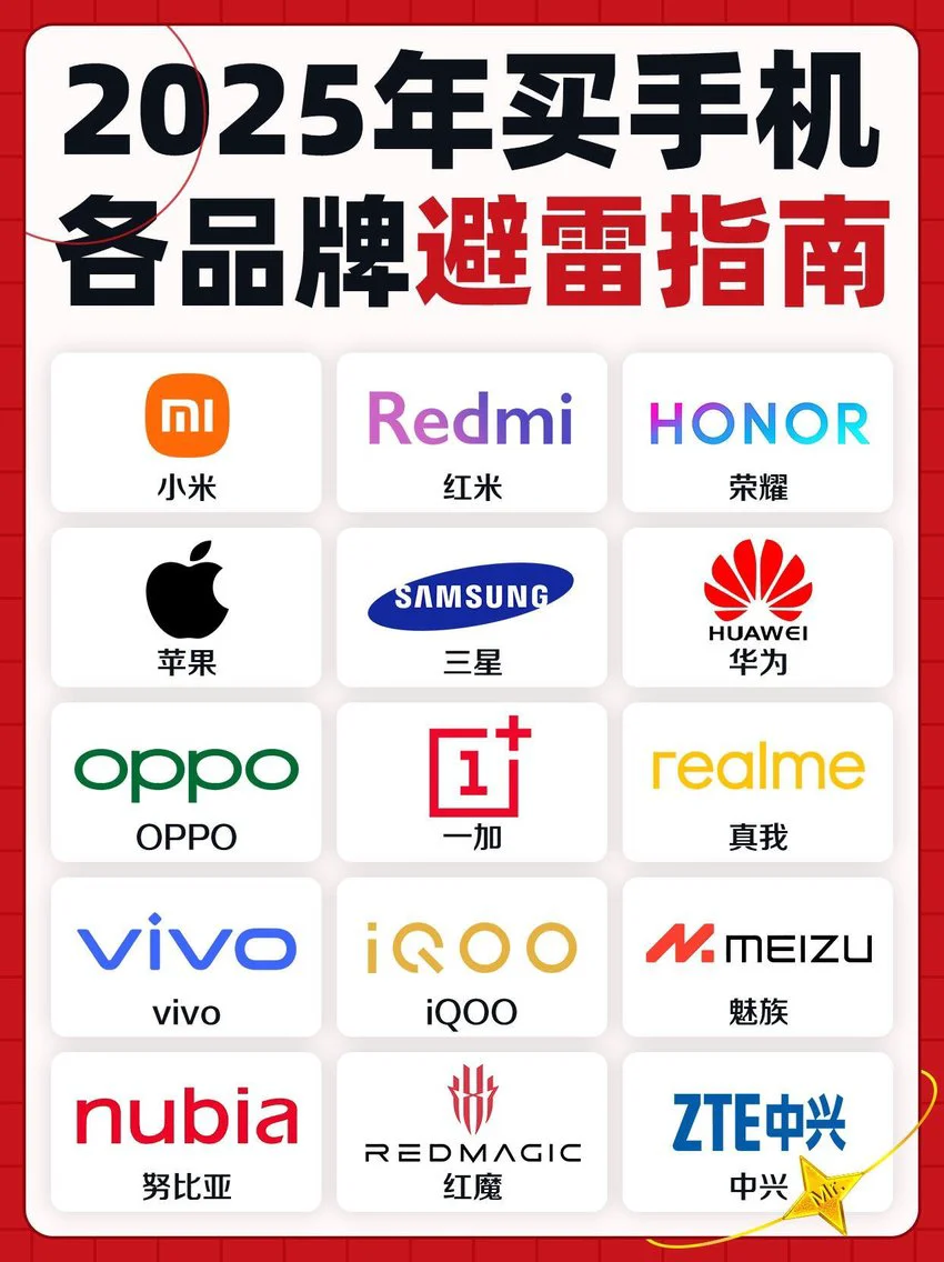 2025年春节马上结束了,近期想要换手机的朋友们还在纠结买哪一款吗?看过来,为大家整理了15款常见手机品牌的购买口诀,不知道怎么选手机的朋友看这一篇就够了!
