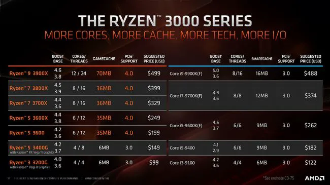 有关具体的产品方面,目前AMD已经公布的产品大致包含了八款产品,分别为定位极致发烧性能的锐龙9 3900X和3950X,定位于高性能的锐龙7 3700X和3800X,另外还有定位于主流性能的锐龙5 3400G、3600和3600X,最后是定位于入门级的锐龙3 3200G。