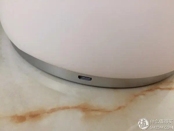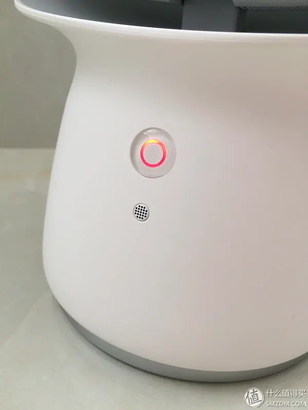 设计非常简洁,只有一个按键。长按可进行开关机。运行时有蓝色环形指示灯,电量不足时,指示灯显示红色,而有语音指令时灯光闪烁。开关键下方是全向高保真麦克风,据介绍具有自动回声消除,智能降噪处理和5米范围拾音的特性。