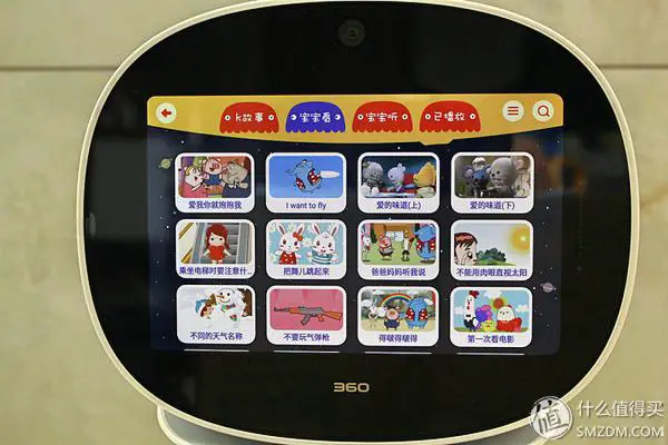 有K故事、宝宝看、宝宝听三大项。360机器人与铁皮人、歪歪兔等多个知名早教厂商合作,资源、内容丰富。
