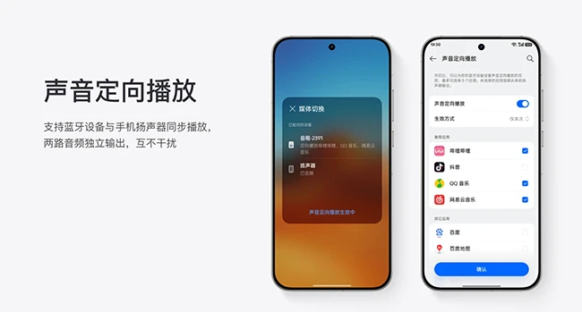 此外,声音定向播放功能让用户可以自定义音频播放通道,蓝牙音箱和手机扬声器可同时播放不同音频,无论是打游戏时想听音乐,还是车上用蓝牙车机放歌的同时手机外放导航,都能实现互不干扰的独立控制。