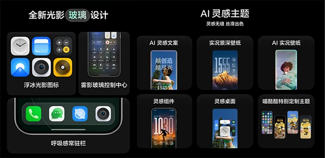 系统采用高透明度处理与柔和模糊层技术,使信息层次清晰可辨,营造出纯净、开放的视觉体验。浮冰光影图标通过恰到好处的间距与网格化秩序,呈现呼吸般自然的轻盈节奏,让每一次交互都充满生命感。雾影玻璃控制中心和呼吸感常驻栏进一步强化了系统的通透立体质感,让整个界面"处处都精致"。