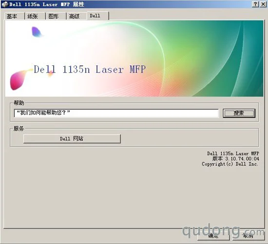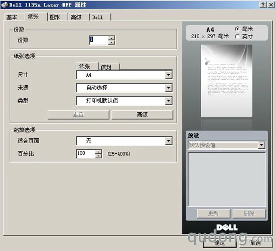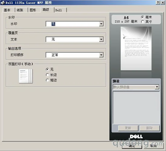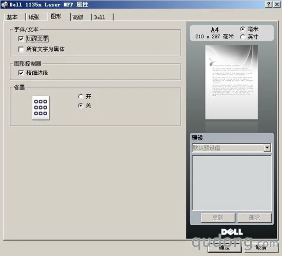 戴尔1135n的打印首选项界面比较简洁,包括基本、纸张、图形、高级、Dell服务等5个页面,用户可以对打印质量、页面布局、纸张选择等进行相应的设置。