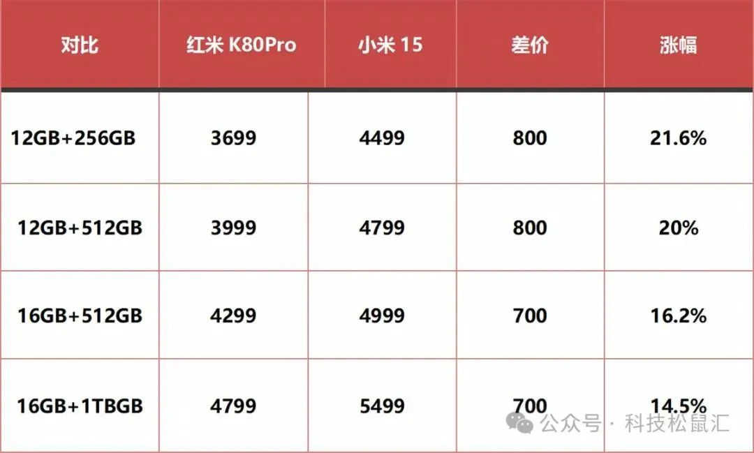 我们还是先对比价格,毕竟价格才是决定性因素。红米K80Pro售价3699起,小米15售价4599起,相同内存的版本差价700-800,涨幅为14.5%-21.6%。通过对比我们发现,12GB运行内存版本,小米15贵20%以上,明显更适合买红米K80Pro,如果你准备上16G运行版本,小米15只贵了15%左右,小米15也是可以考虑的。