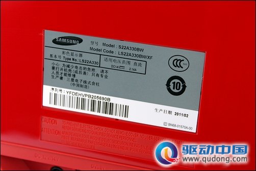 我们此次收到送测的这款产品是一款22英寸16:10的产品,所以在显示器背部的铭牌上我们看到这款显示器的型号为S22A330BW,出厂日期为2011年2月。在铭牌下面我们可以看到红韵的接口部分,由于SA330采用外置电源设计,所以这也成为这款显示器超薄设计的根本。另外显示输入接口方面,红韵SA330只具备了常用的VGA模拟信号接口和DVI-D数字信号接口,而对于目前较为流行的高清数字接口HDMI则没有采用,这一点不能不说是个遗憾,其实这也表明了红韵SA330其实是一款中低端产品,主打性价比和时尚外观,同时16:10下的分辨率难以支持1080P高清点对点显示,所以即使采用了HDMI接口也显得有些鸡肋了。