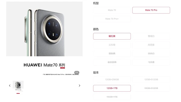 Mate 70 Pro提供曜石黑、雪域白、云杉绿和风信紫四种配色,同样有12GB+256GB、12GB+512GB和12GB+1TB三种选择。