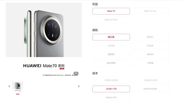其中Mate 70标准版提供曜石黑、雪域白、云杉绿和风信紫四种配色,有12GB+256GB、12GB+512GB和12GB+1TB三种选择。