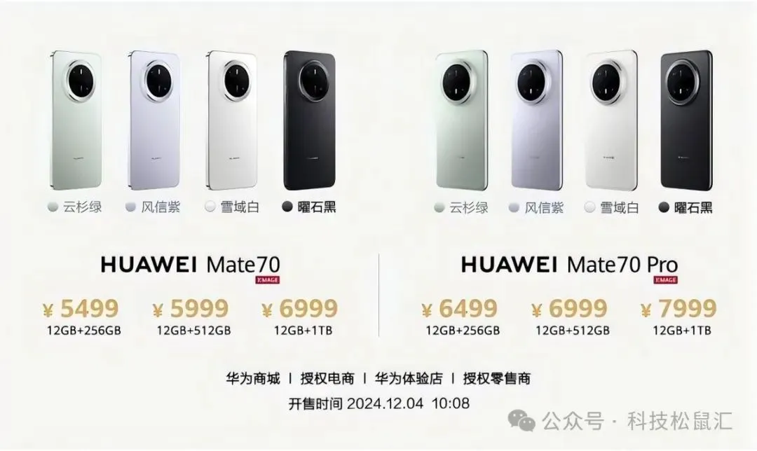 我们先来对比一下价格,华为mate70和mate70Pro都是标配12G运行内存,存储空间有256GB、512GB和1TB可选,机身配色也保持一致,共有云杉绿、风信紫、雪域白和曜石黑4种颜色可选。我们对比相同内存的版本,Pro比标准版贵1000,那么Pro版本到底有哪些升级呢?