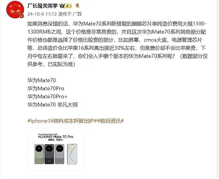 此前,据博主@厂长是关同学 爆料,称华为Mate70系列所搭载的麒麟芯片,单纯造价费用大概在1100元-1300元之间,这个价格是非常昂贵的,而且在屏幕、电源管理芯片、cmos大底等零部件也都选用了比较贵的部分,整机造价要比苹果16系列高处30%左右,但售价却不会比苹果贵。