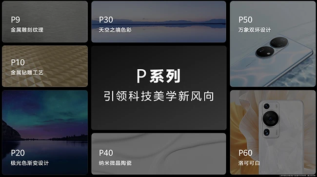 华为P系列自2021年问世以来,距今已经拥有12年的历史,从P9的金属雕刻工艺、P10的金属钻雕工艺、P20的极光色渐变设计、P30的天空之境,再到P60的洛可可白,每代产品在外观设计都引领了潮流,成为友商们竞相模仿的对象。