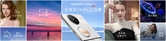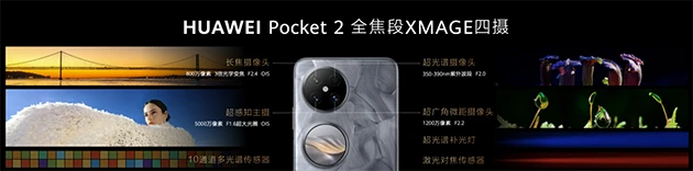 华为Pocket 2所搭载的全焦段XMAGE四摄,是迄今为止小折叠屏当中规格最高的影像系统。其中,5000万像素超感知主摄,拥有小折叠领域最大进光量的传感器,再加上RYYB超感知技术在感光性能上的优势,这使得华为Pocket 2无论是日落还是深夜,都能轻松拍摄“暗处不过曝,亮处有细节”的照片;800万像素3倍长焦,则是小折叠屏业界首个3倍光学长焦,既能在拍摄远景时提供更清晰的画质,也能在拍摄人像时带来更强烈的背景虚化效果。同时,得益于华为Pocket 2配备了圆形外屏,用户还能将其作为取景器使用后置主摄、长焦自拍,在常规自拍、多人合影、仿他拍、眼妆特性时得到更好的画质与更出色的效果。此外,华为Pocket 2还搭载了全新的XD Fusion Pro人像引擎,真实感主摄自拍能实现更高级、更精致、更自然的人像优化效果。
