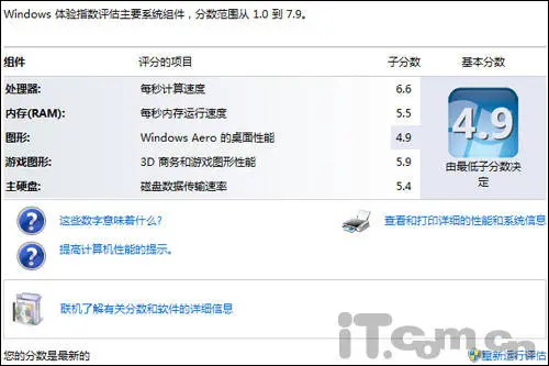 性能测试方面,我们首先采用了windows 7操作系统所自带的性能索引评分,在评分中我们可以粗略的对整机处理器、内存、图形、游戏性能、主硬盘等五个组件的性能进行一个简单的对比评估。这款华硕U43JC最终得分为4.9分,其中最高性能得分来自于处理器模块,高达6.6分。而最低分则来自于图形模块,仅仅只有4.9分,但索性游戏图形模块分值还较为不错,达到了5.9分。至于内存以及硬盘模块均在5.5分上下,显得中规中矩。