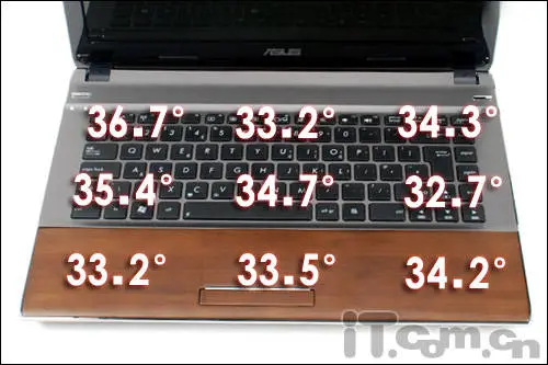 大家知道,竹子属凉性,天生散热能力就不十分不错,在夏天人们大多采用竹制的凉席,坐垫进行避暑散热。而这款华硕竹子本U43JC热感体验也自然要更加优越一些,从上图我们即可得知,整个竹子托板区域温度表现都不高,而铝制键盘区域则显得温度偏高,尤其是靠近CPU散热出风口的左侧区域,温度达到36度以上,热感明显。但从整体上来看,这款华硕U43JC的温度表现也是可以被接受的,基本上达到了目前14寸笔记本的温度基准。