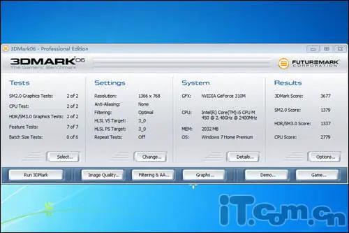 在显示性能方面,我们采用3DMark06软件进行测试评分,在系统分辨率为1366*768的环境下,整体分数为3677分,相比HD5470独显分值十分相近,两者性能差距不大。只是后者支持微软DX11,因此在游戏模块方面可能存在一定优势。当然,同样作为一款入门级独显,HD5470在真正运行大型DX11游戏时,帧数表现也不会太优越。
